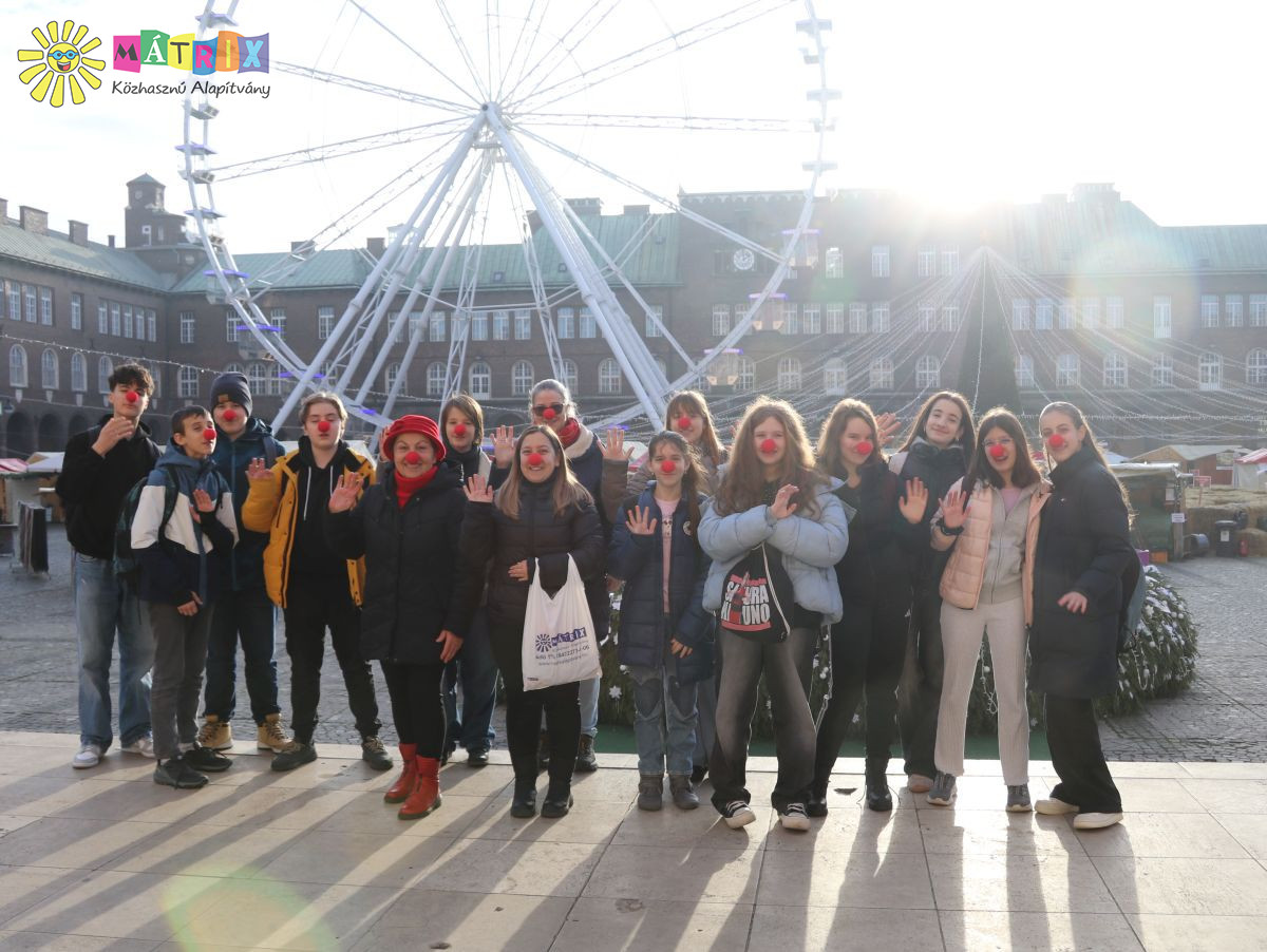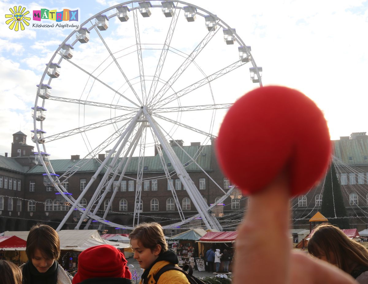 Irány az óriáskerék! A magasba emelkedő kabinokban ülő fiatalok lelkesen kiabáltak át egymásnak és mutogatták a látnivalókat, látszott, nagyon élvezik az utazást, és gyönyörködtek a kilátásban. Természetesen fotók is készültek. A gyerekek a Bohócdoktorok kíséretében érkeztek a karácsonyi vásárban felállított óriáskerékhez.